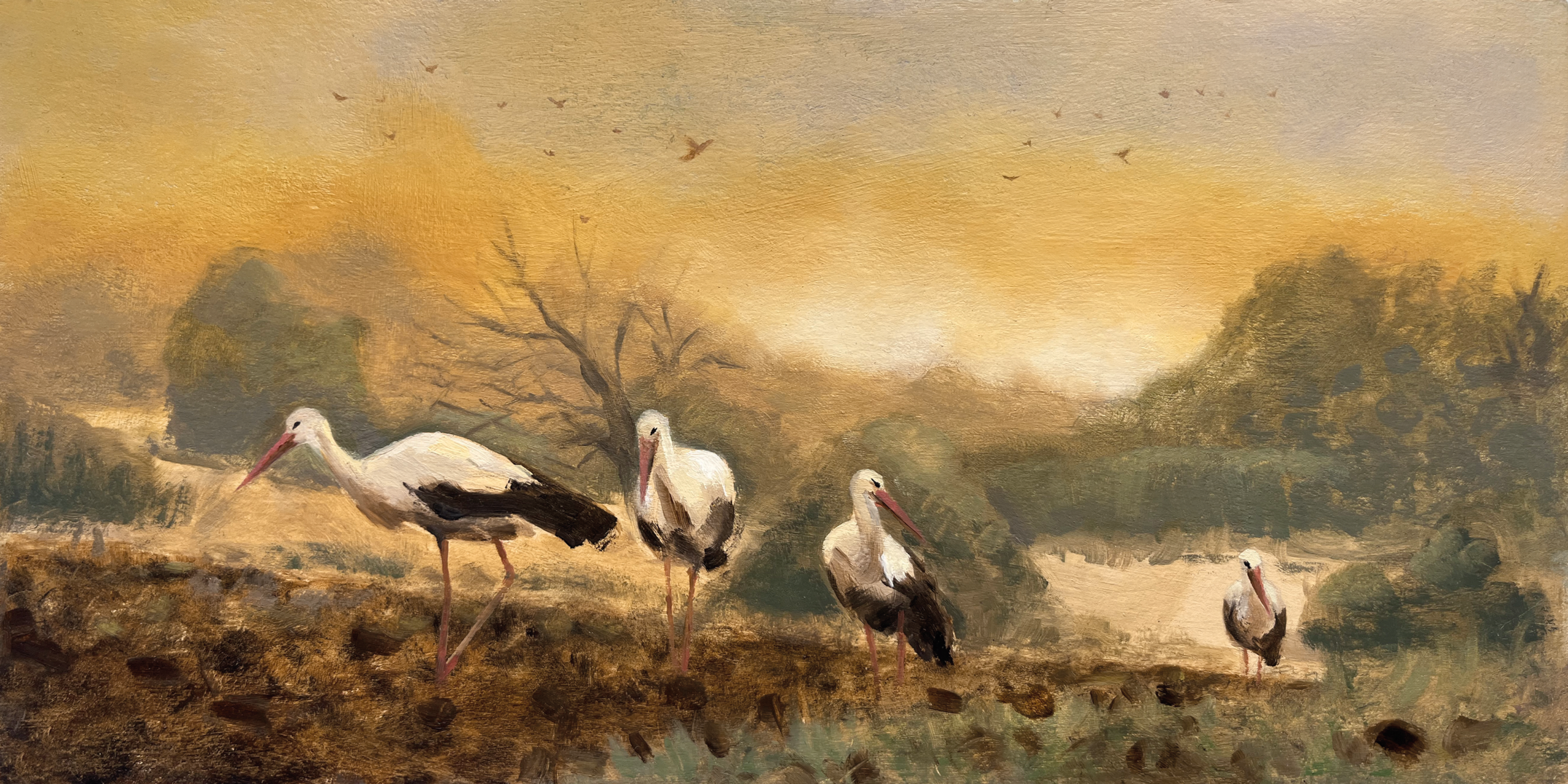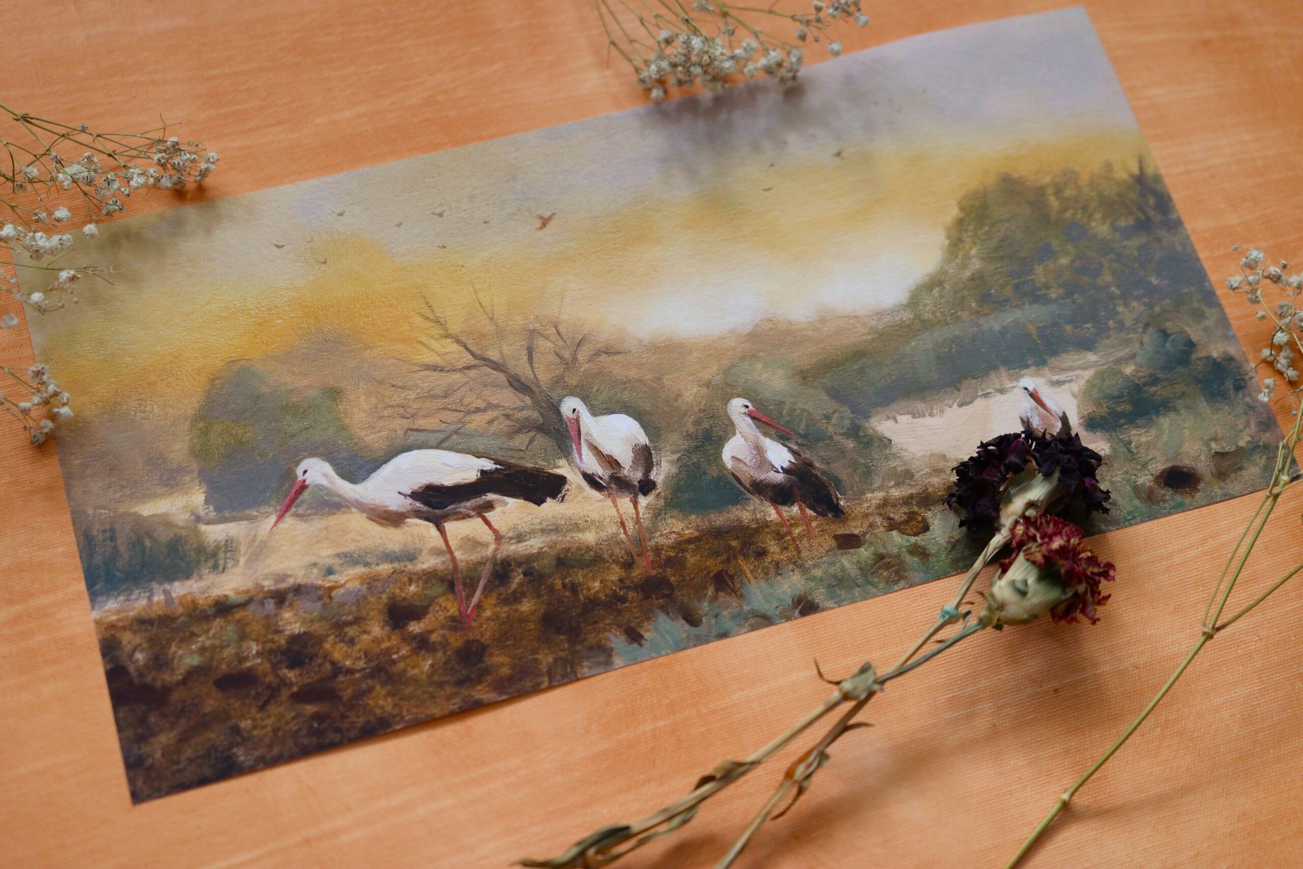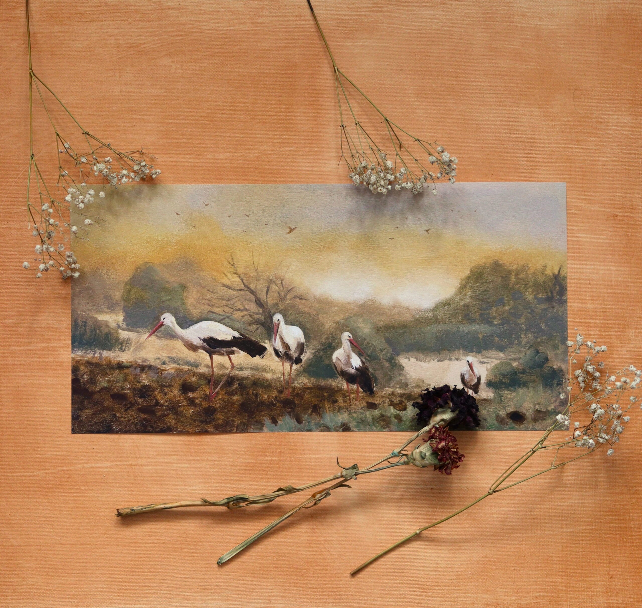 Wydruk mojego obrazu pt. „Wędrówka bocianów”, idealny do oprawy i dekoracji wnętrz.